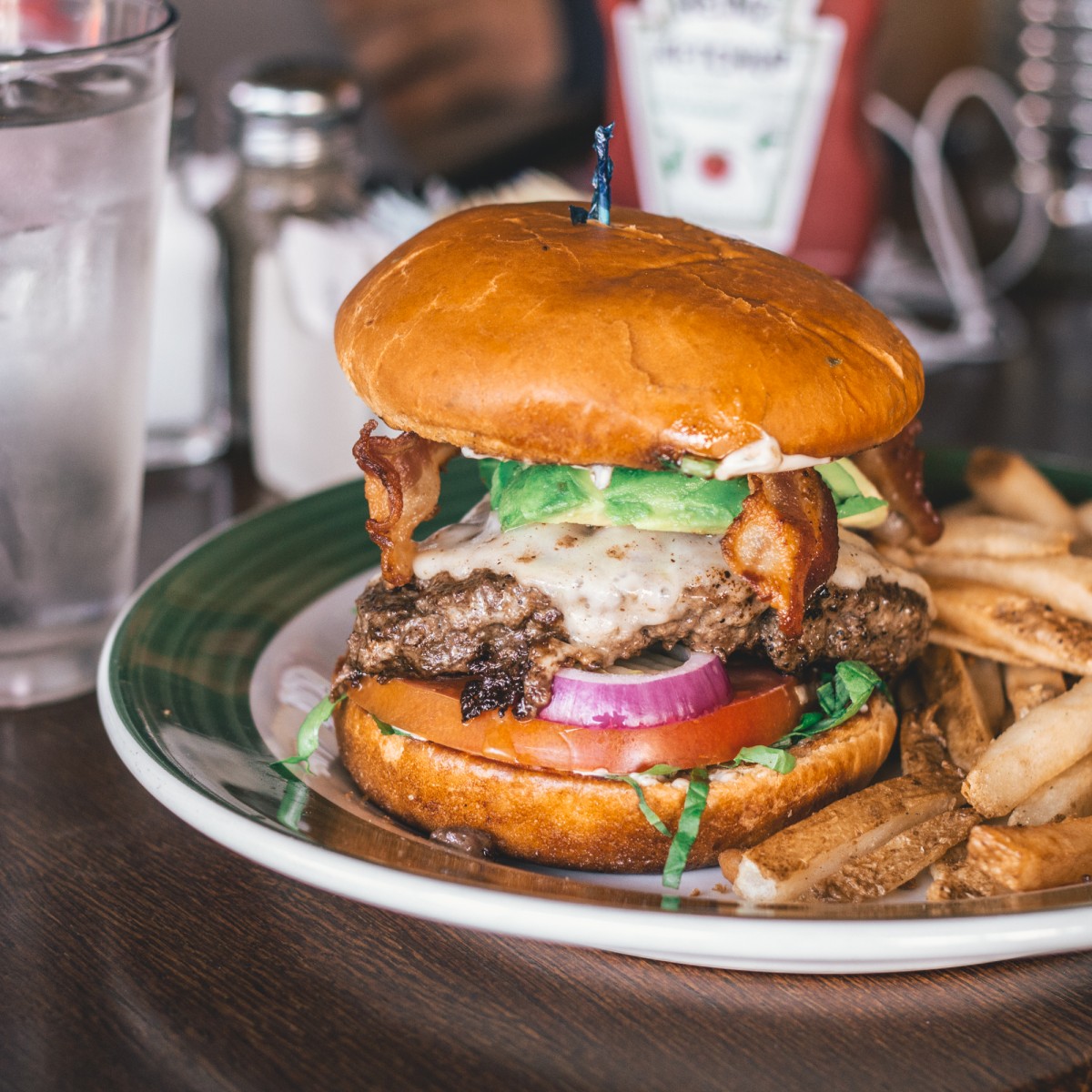 Jugosa hamburguesa cubierta con queso suizo, tocino y frescas rebanadas de aguacate. Servida con mayonesa de tomates secos en pan tostado.