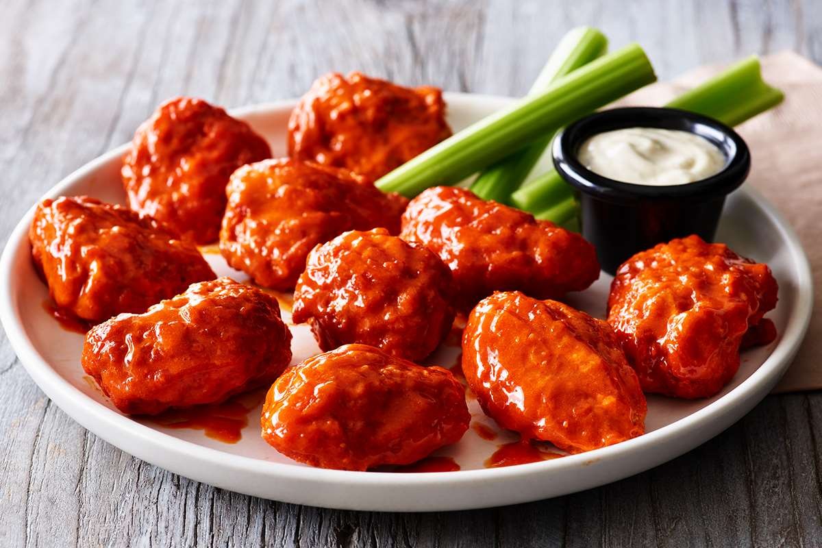 ¡Uno de los favoritos! Crujientes trocitos de pechuga de pollo ligeramente empanizados y bañados con la salsa de tu elección, acompañados con palitos de apio y aderezo bleu cheese o ranch.