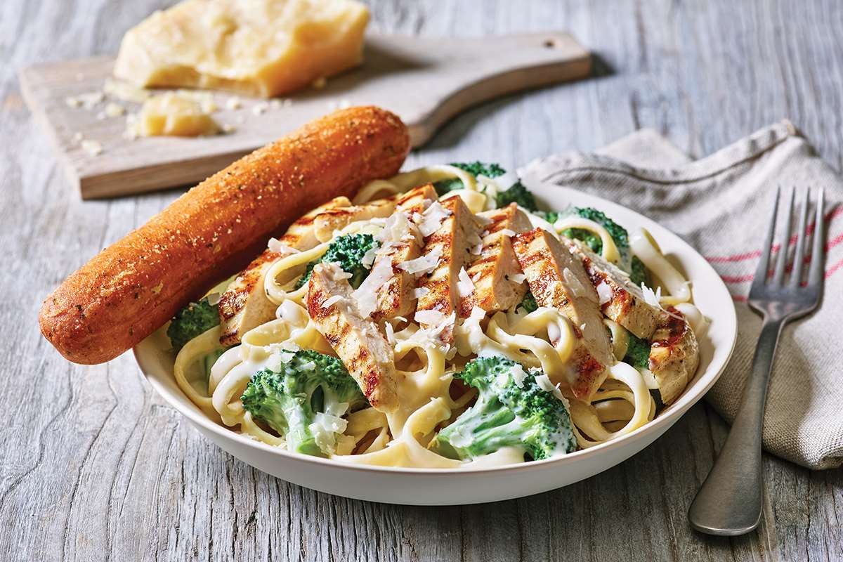 Pasta fettuccine mezclada con brócoli fresco, salsa Alfredo y pechuga de pollo a la parrilla. Se sirve con pan de ajo.