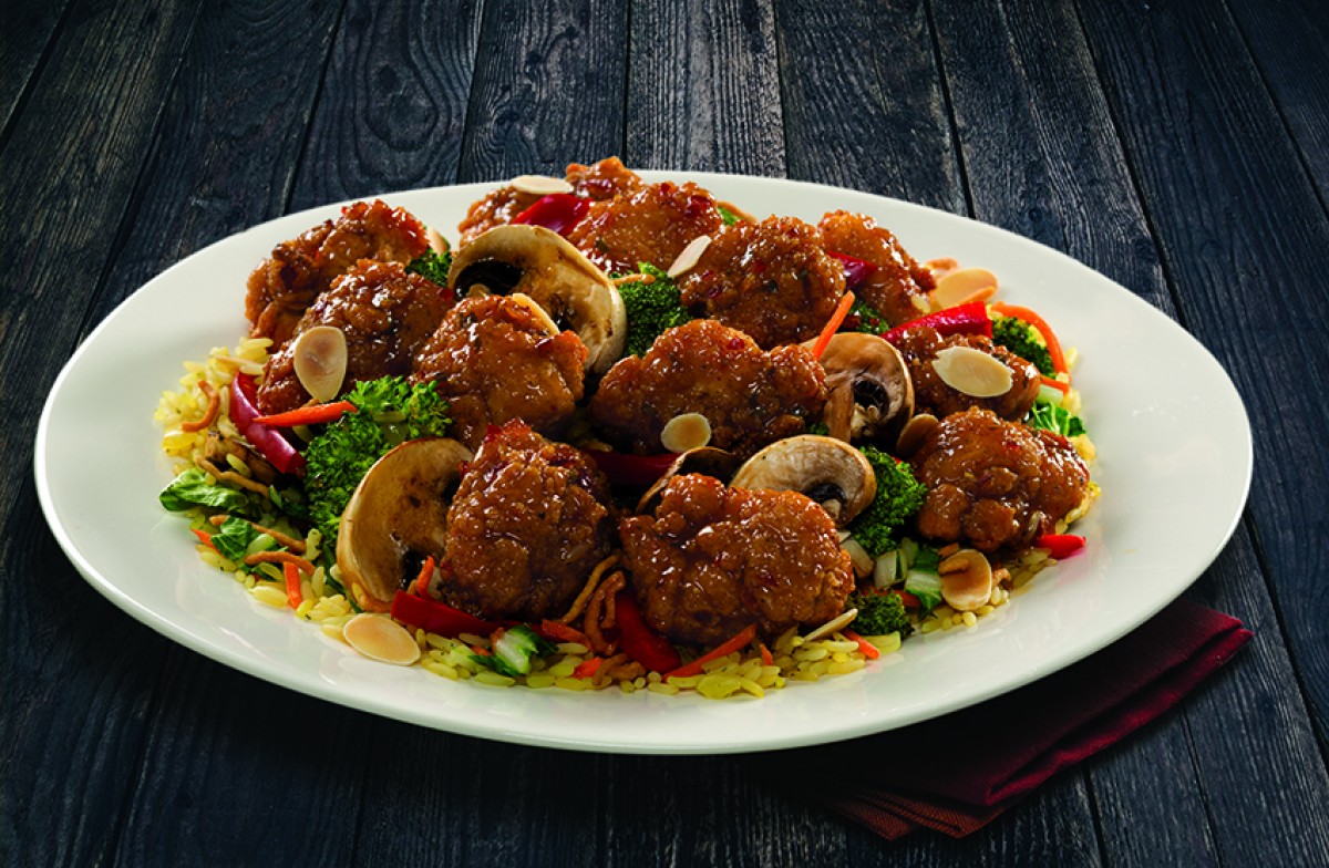 Crujientes cubitos de pollo empanizados, bañados con nuestra exclusiva salsa oriental a la naranja. Servido con arroz almendrado, mezcla de vegetales asiáticos, fideos de arroz tostado y almendras tostadas.