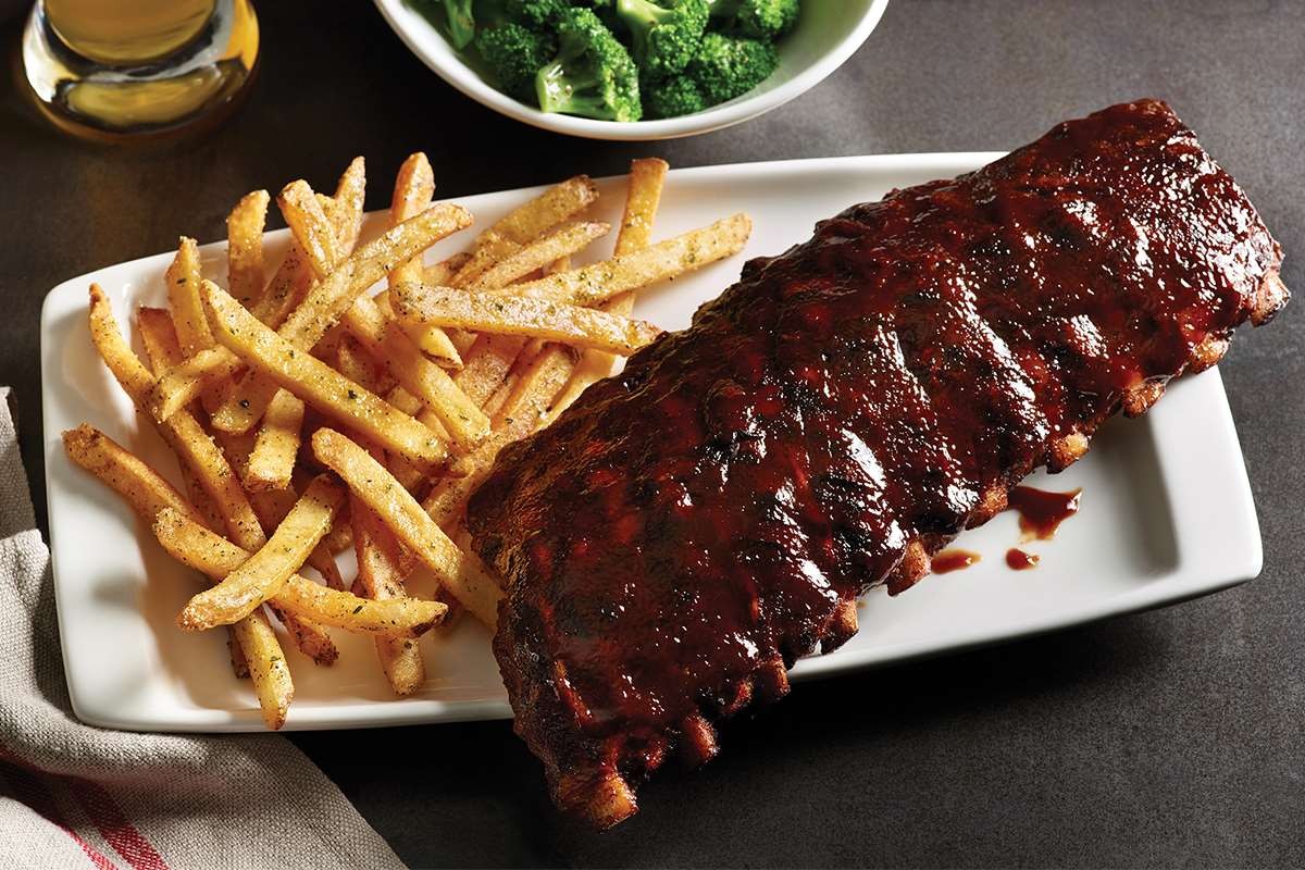 Jugoso costillar de cerdo asado a la parrilla y bañado con la salsa de tu elección. Se acompaña de papas fritas y elote.