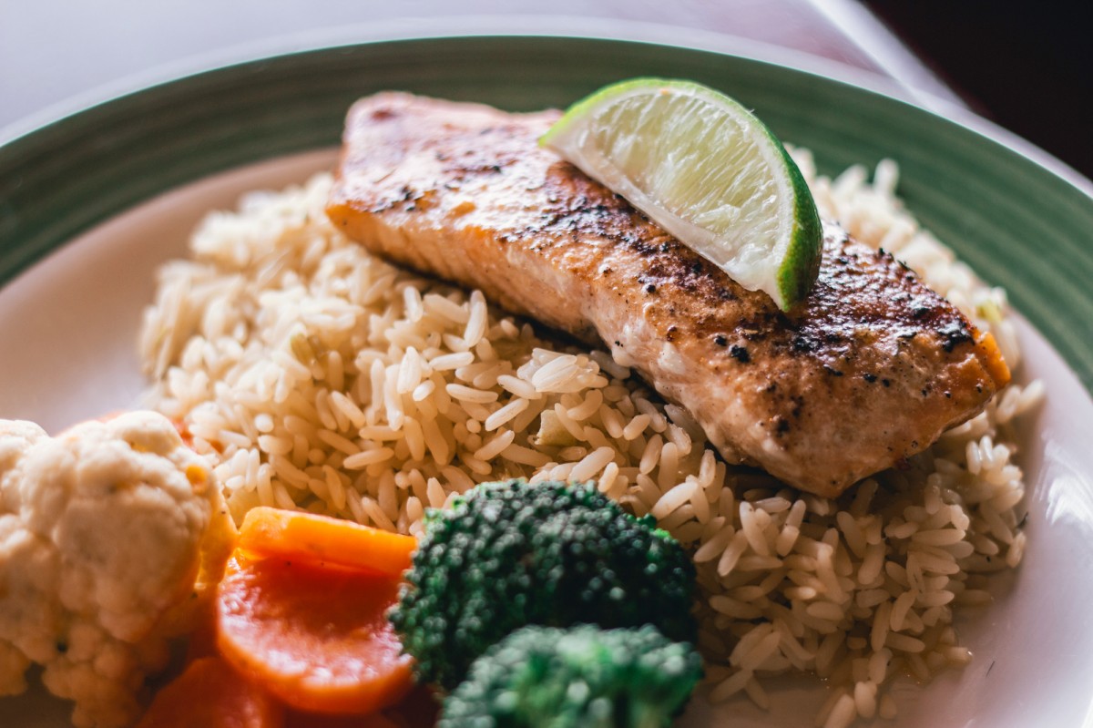 Filete de salmón a la parrilla ligeramente bañado con nuestra mantequilla de tomillo y ajo. Servido con arroz almendrado y vegetales al vapor.