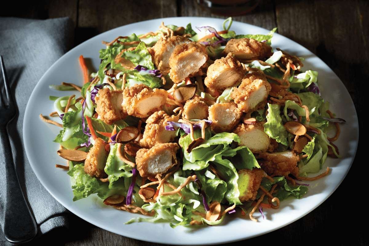 Nuestra original mezcla de lechugas, almendras y tallarines de arroz tostado, bañada con delicioso aderezo oriental. Servida con trocitos de pollo empanizados, o si lo prefieres, con pollo a la parrilla estilo teriyaki.