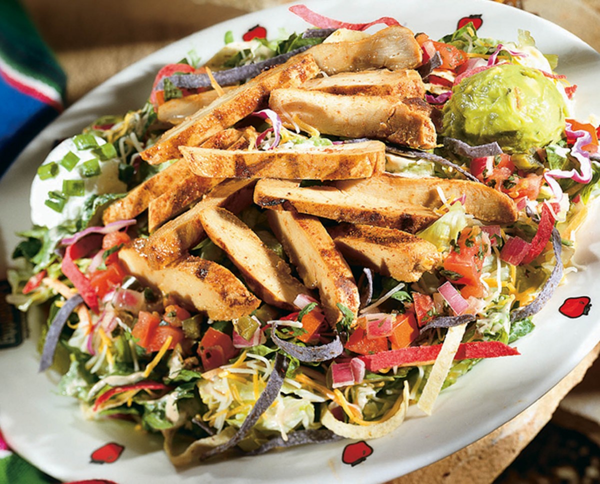 Mezcla de lechugas, tiritas de tortilla fritas, queso y pico de gallo en nuestro aderezo mexi-ranch. Servido con pollo a la parrilla marinado con salsa cilantro-lime. Acompañado de crema agria, guacamole y salsa.