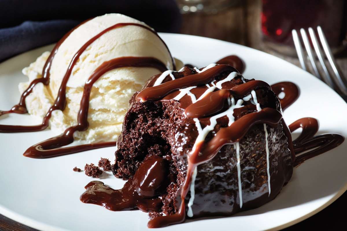 Pastel de chocolate relleno de suave chocolate caliente, con helado de vainilla.